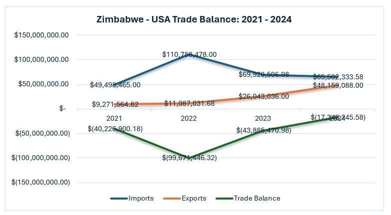 Zimbabwe is experiencing exponential growth in exports to the USA. Figures provided by Zimbabwe National Statistical Agency, shows a sustained increase in exports to the USA from about US$9.1 million in 2021 to US$48.8 million in 2024, as indicated in the graph below: